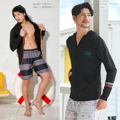 カラフルな 水着 に単色のラッシュガード、 モノトーン 水着 には思い切って派手・柄物などのラッシュをコーデするのがオススメ! トップス ボトムス パンツ 豊富にラインナップ。