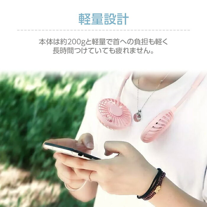 商品名 アロマ首掛け扇風機/ライト機能付き 重量 284g電力3.75W バッテリー電源リチウムイオン電池2000mAh バッテリー持ち時間2〜5時間 バッテリー充電時間3時間 点灯2パターン 風量調節3段階 入力DC5V 1A(USB充電式) 素材本体:ABS樹脂 備考髪の毛を巻き込む恐れがありますので着脱の際は必ず電源をオフにした状態で行ってください。
